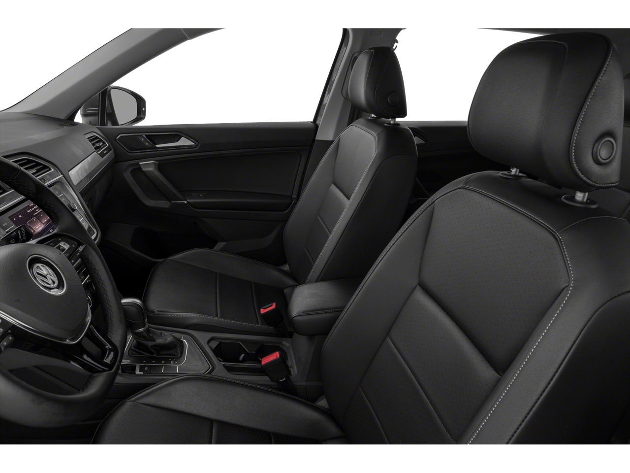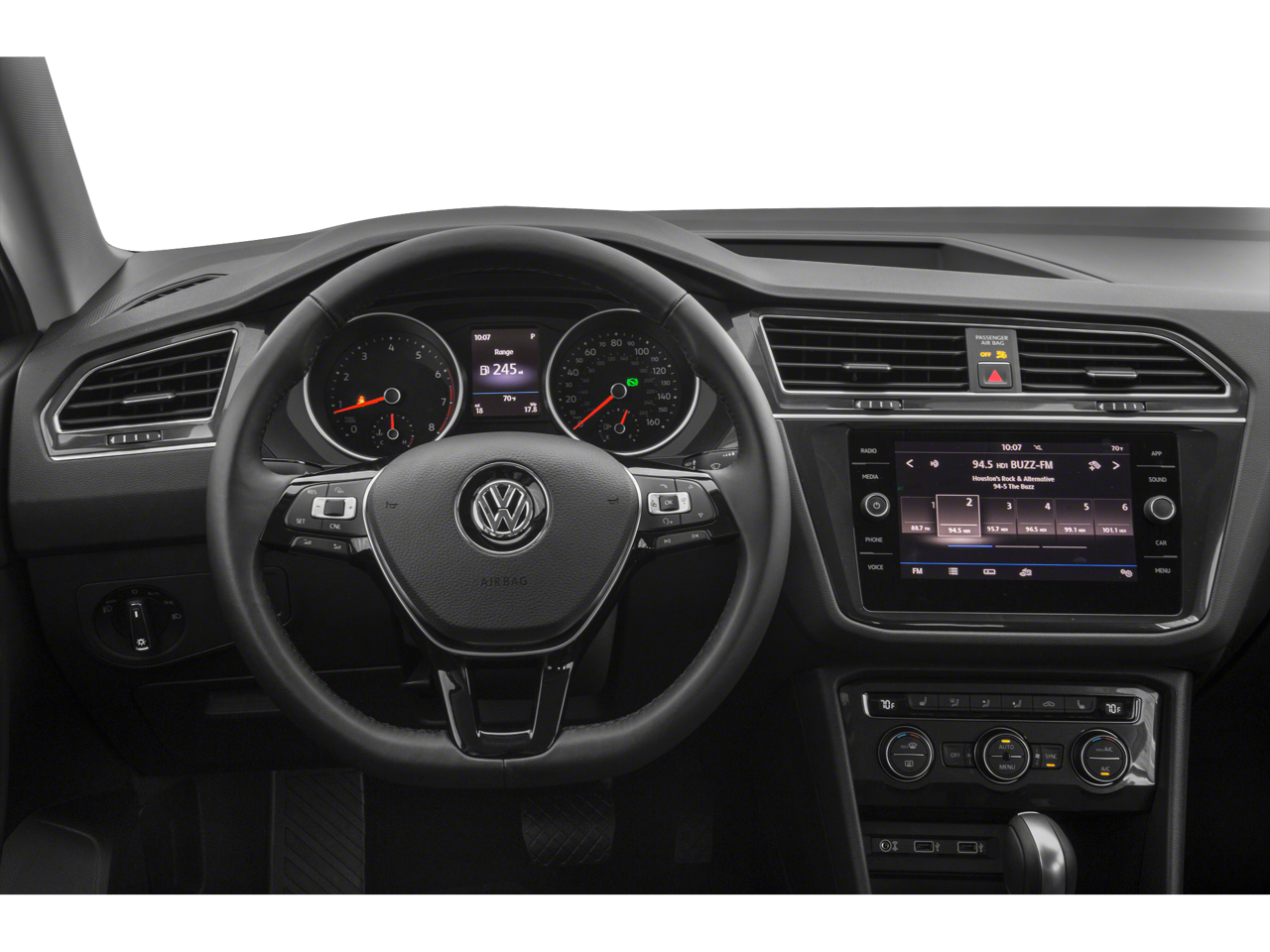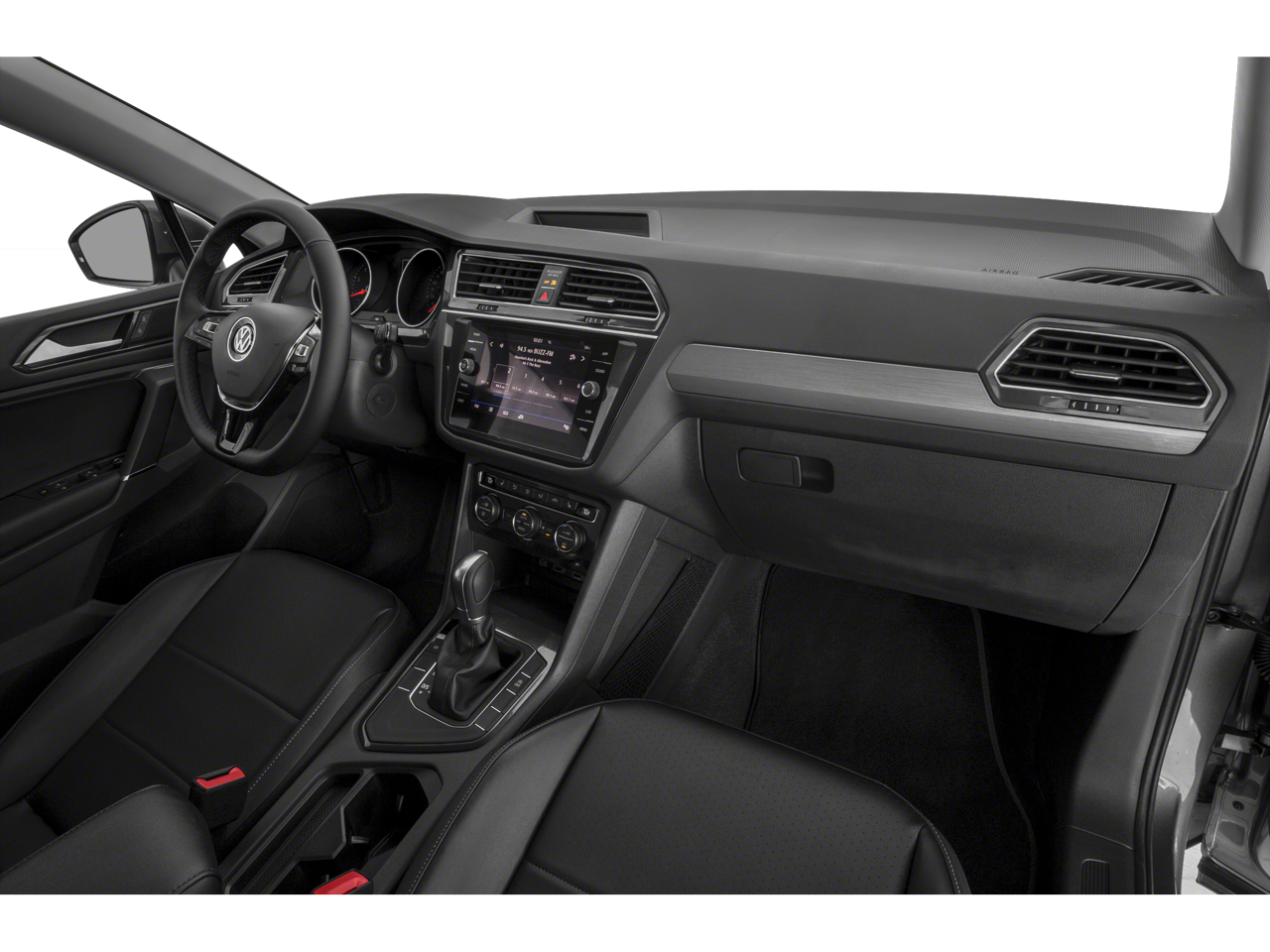 Inside, the Tiguan's spacious cabin offers seating for up to seven, with a split-folding rear seat that provides ample cargo space for all your adventures. The Perforated V-Tex Leatherette Seating Surfaces and Heated Front Comfort Seats add a touch of luxury, while the Composition Media AM/FM/HD Radio and Steering Wheel Mounted Audio Controls keep you connected and entertained.